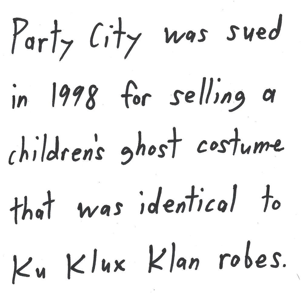 Party City was sued in 198 for selling a children's ghost costume that was identical to Ku Klux Klan robes.