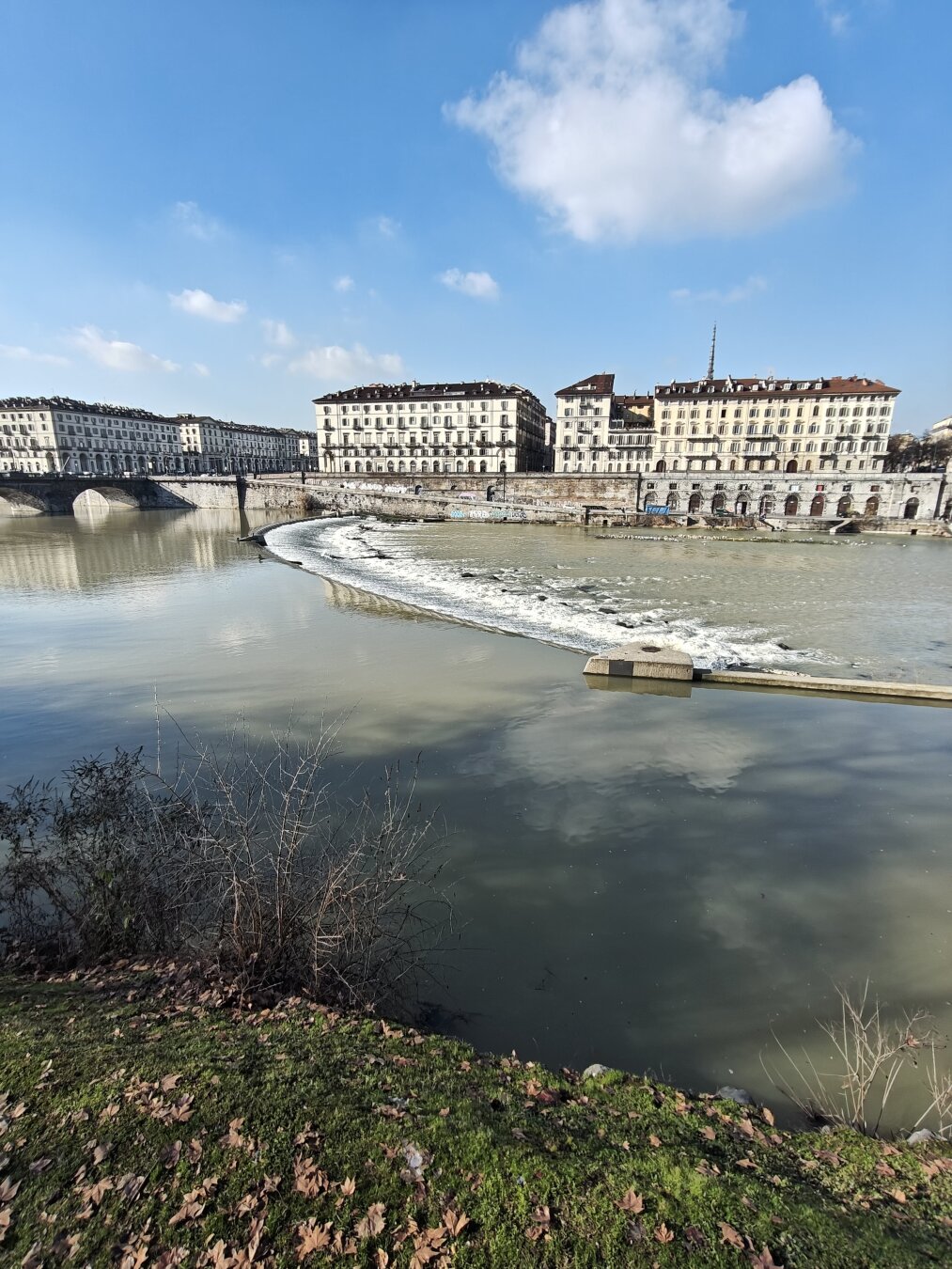 Veduta panoramica del fiume Po a Torino in una giornata soleggiata. In primo piano, una sponda erbosa cosparsa di foglie secche. Al centro del fiume, una pescaia curva crea una piccola cascata di schiuma bianca. Sullo sfondo, eleganti palazzi storici in stile sabaudo si affacciano sulla riva opposta sotto un cielo azzurro con poche nuvole.