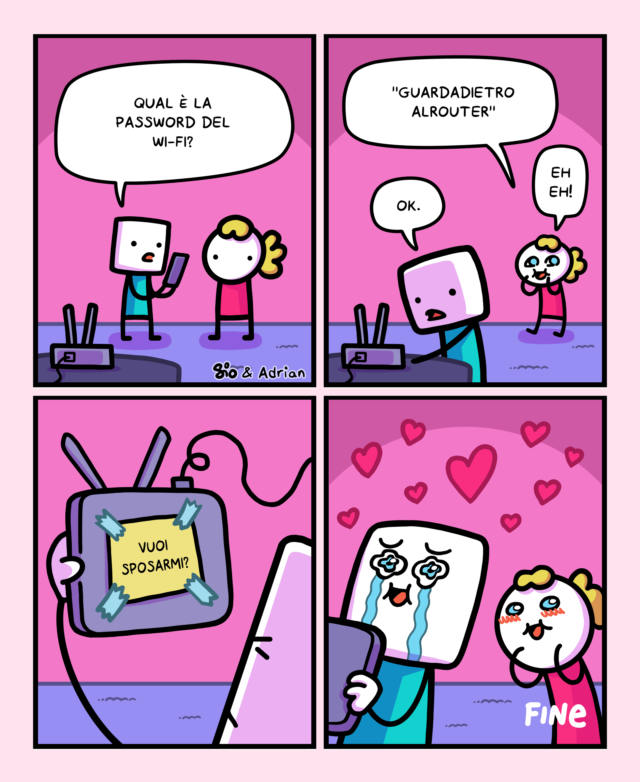 1 Un tizio chiede a una tizia: “Qual è la password del wi-fi?” 2 La tizia risponde: “”Guardadietroalrouter” eh eh!” Il tizio dice: “Ok.” e si avvia verso il router. 3 Dietro al router c’è un bigliettino con su scritto: “Vuoi sposarmi?” 4 Il tizio abbraccia commosso il router. La tizia ha le guancine tutte rosse. FINE
