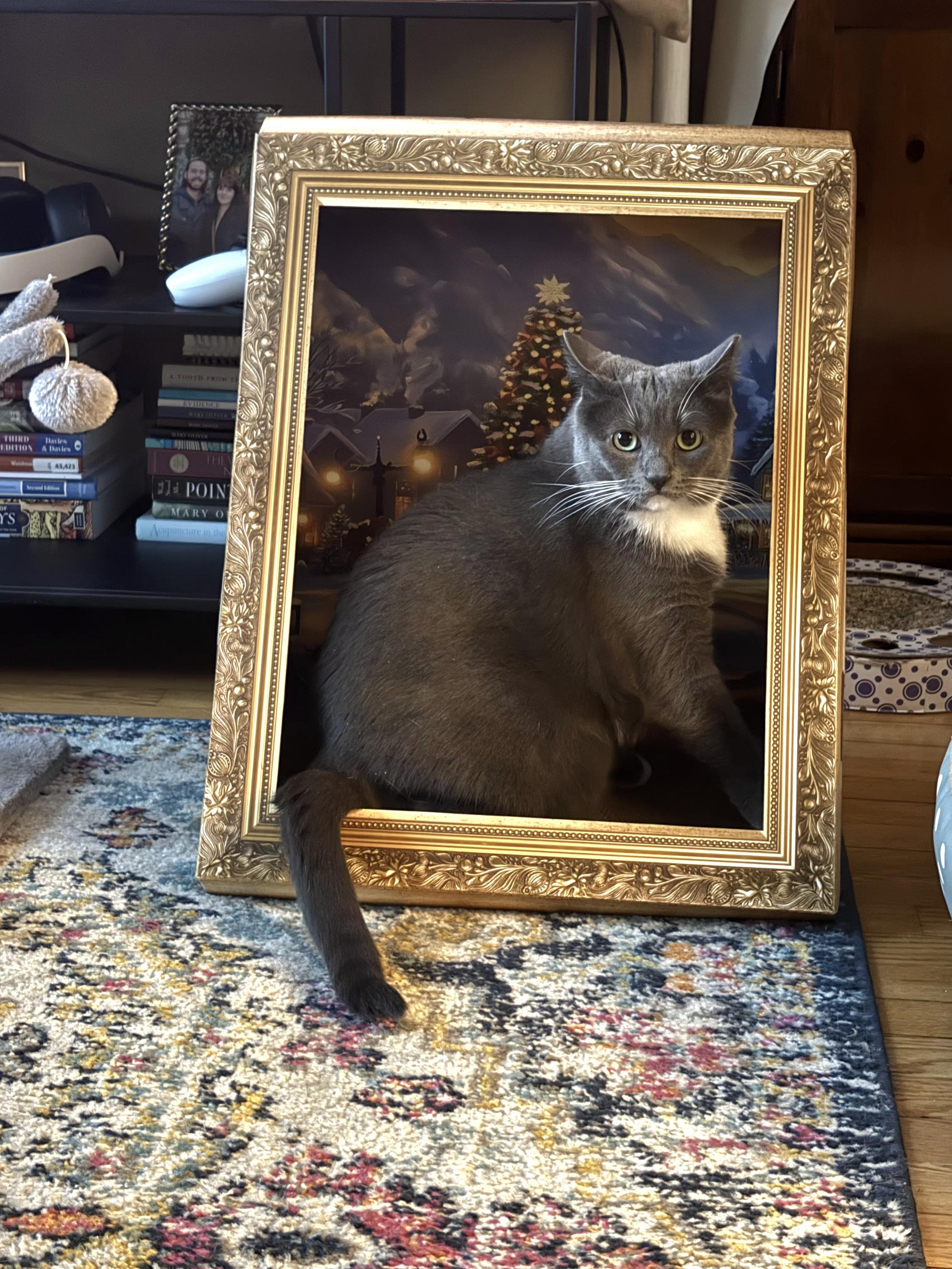 A gray and white tuxedo cat sits inside an empty, ornate gold picture frame that is propped up on a colorful patterned rug. The cat's tail drapes over the bottom edge of the frame, and a holiday-themed painting of a snowy village with a lit Christmas tree is visible in the background behind the cat, creating the illusion of a 3D portrait.
