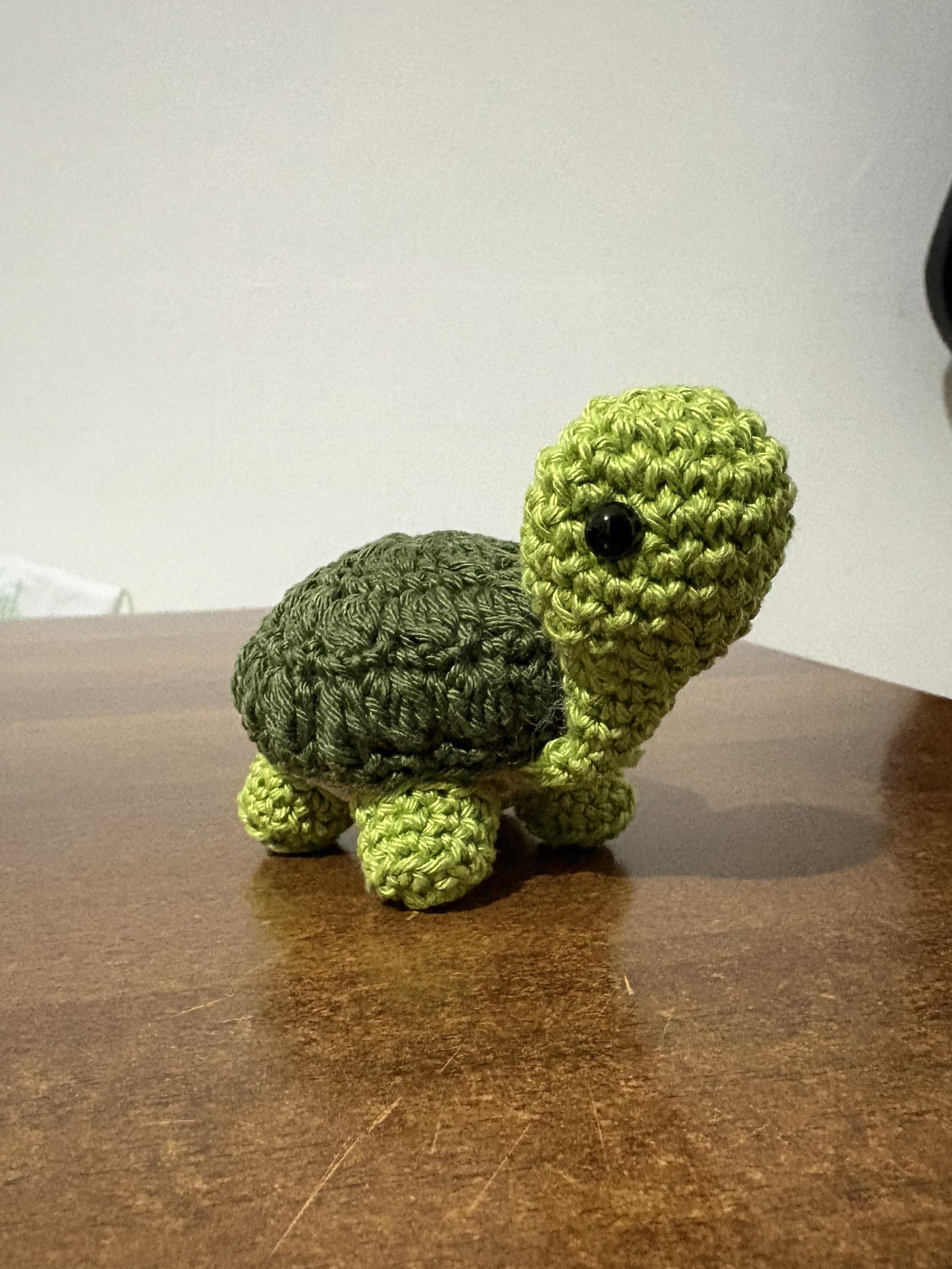 Primo piano di una tartaruga fatta allβuncinetto con carapace verde scuro, testa e gambe verde chiaro e pancia beige