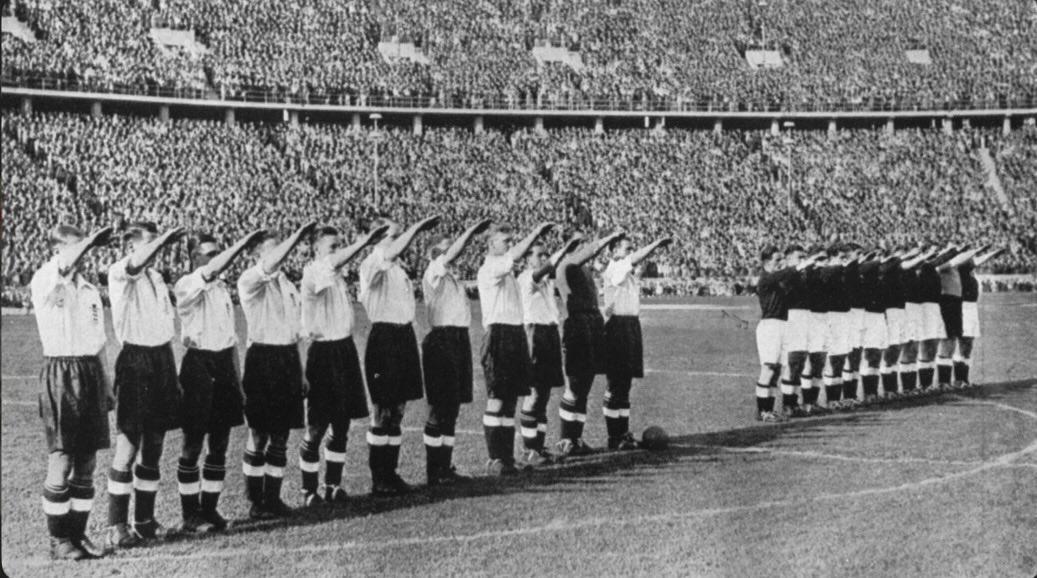 Fußball länderspiel im olympiastadion Berlin 1936, Mannschaften grüßen zu Beginn des Spiels mit dem Heil hitlergruß