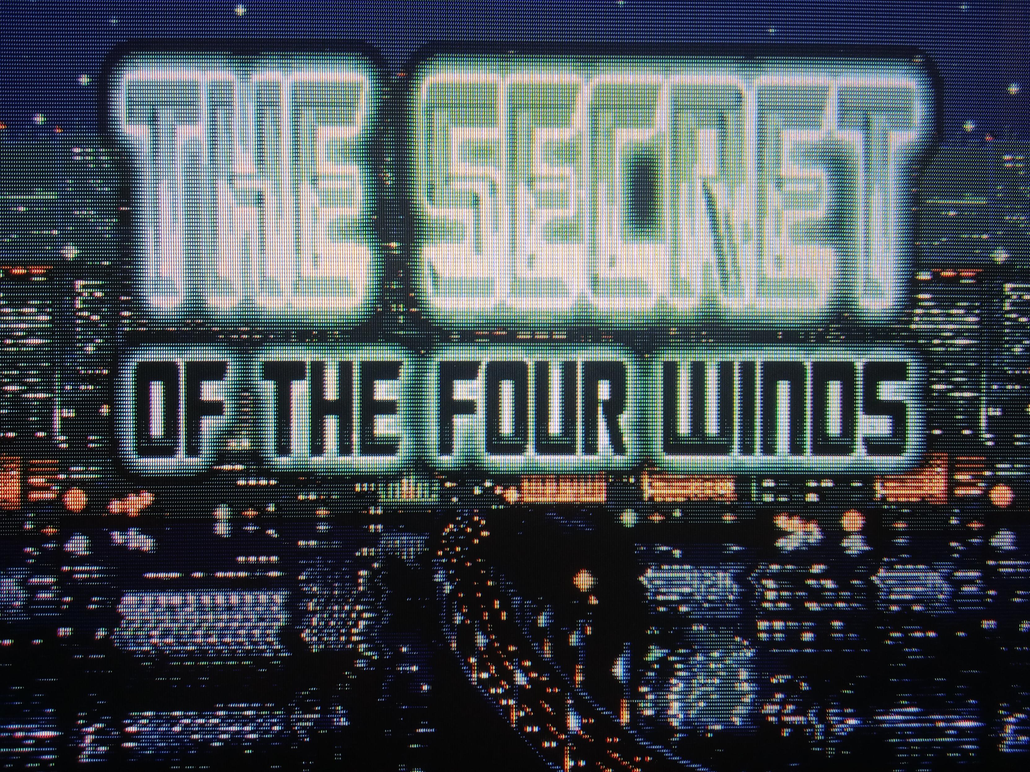 Foto su schermo CRT della schermata iniziale di The Secret of the Four Winds per Megadrive Drive. Il titolo campeggia scritto in stampatello, sullo sfondo di una cittΓ illuminata di notte.