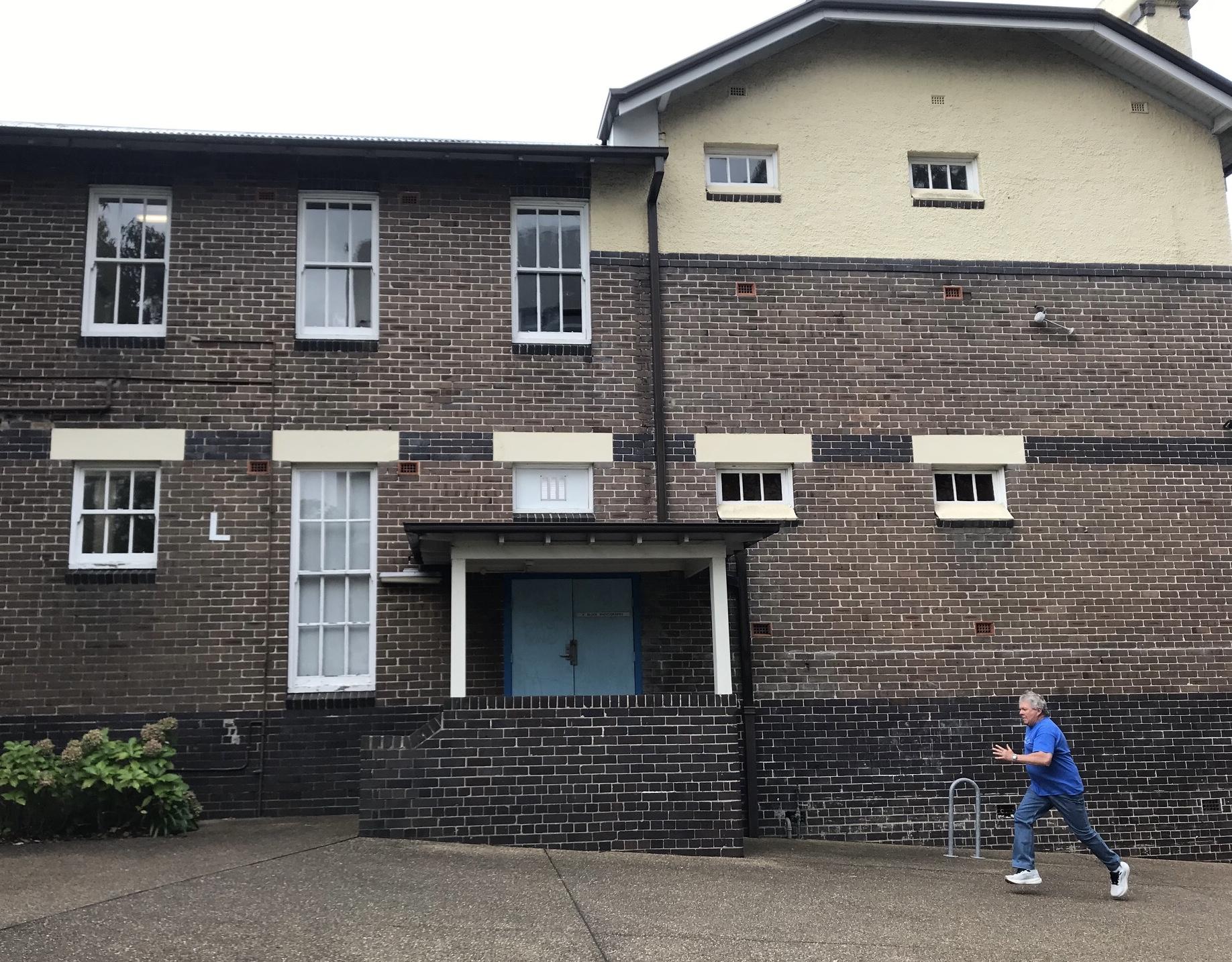An older man runs outside a former school building. Of the several windows the most significant is a second storey one in the middle above a doorway.