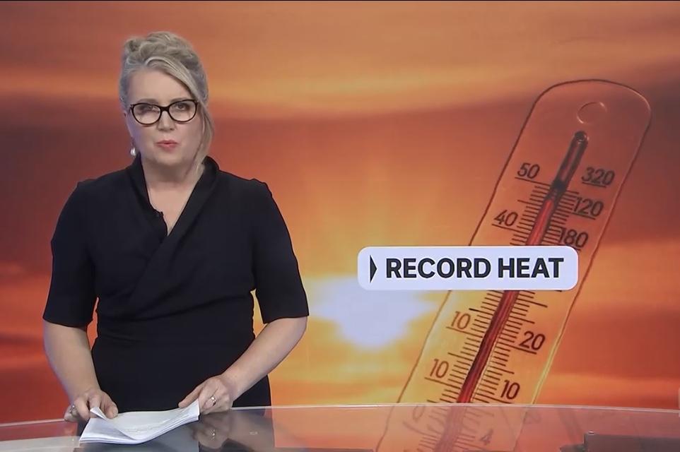 Nonsensical temperature scales on thermometer graphic in background behind newsreader.