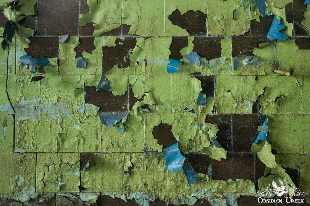 Distressed ceramic tiles are shown, with a flaking green painted surface, revealing a blue undercoat and black tile color.