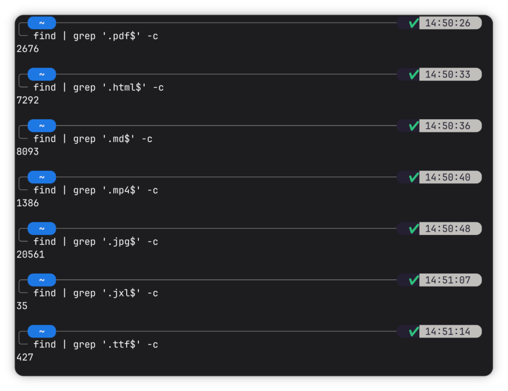 find | grep '.pdf$' -c 2676 find | grep '.html$' -c 7292 find | grep '.md$' -c 8093 find | grep '.mp4$' -c 1386 find | grep '.jpg$' -c 20561 find | grep '.jxl$' -c 35 find | grep '.ttf$' -c 427