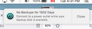 A pop-up warning for a computer warns that it has been 1932 days since my last backup. That's how long it has been since that computer was relegated to secondary occasional use, and backups not needed anymore, so it's not going to happen.