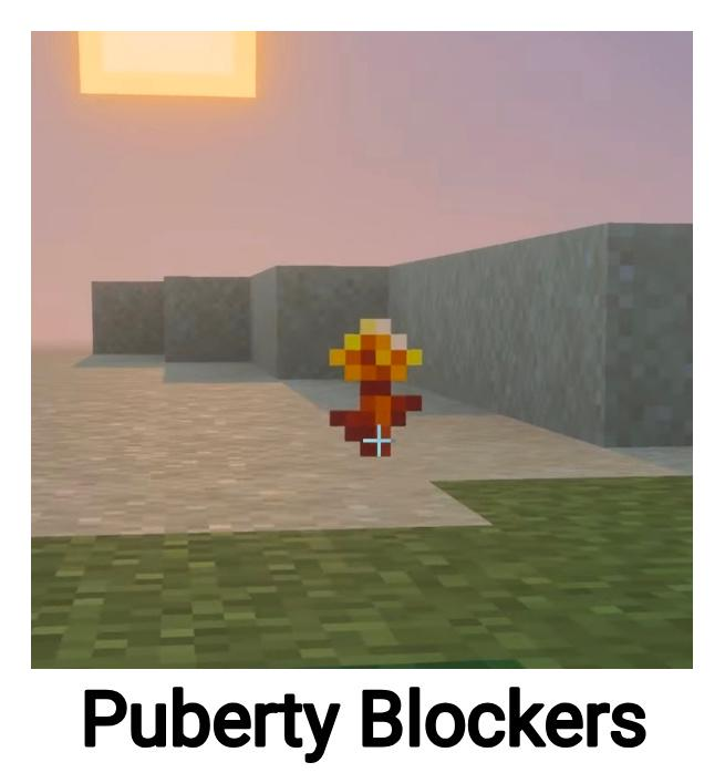 Screenshot from Minecraft with the new Golden Dandelion block placed on a sand. The Golden Dandelion is a flower which when applied to baby animals prevents them from ever growing to adults. The screenshot is captioned "Puberty Blockers".