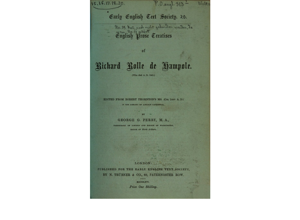 Cover image of the book English prose treatises of Richard Rolle de Hampole :(who died A. D. 1349). https://www.digitale-sammlungen.de/en/view/bsb10748408?page=1