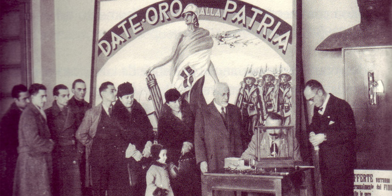 Foto dell'epoca che ritrae alcune persone in fila per donare l apropria fede nuziale. PiΓΉ avanti un banchino con una bilancia e una persona che riceve le fedi. Sullo sfondo un'immagine dell'Italia personificata, vestita della bandiera Italiana, che sorregge un fascio littorio; sulle sfondo truppe armate di moschetto. Sull'immagine campeggia la scritta "Date Oro all'Italia"