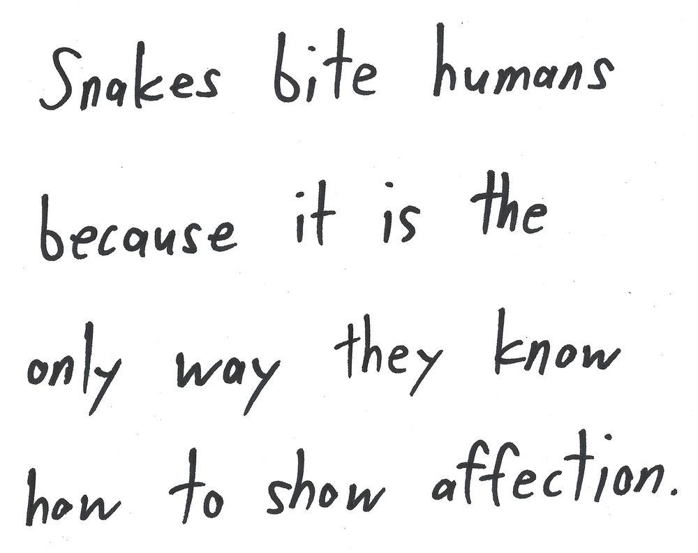 Snakes bite humans because it is the only way they know how to show affection.