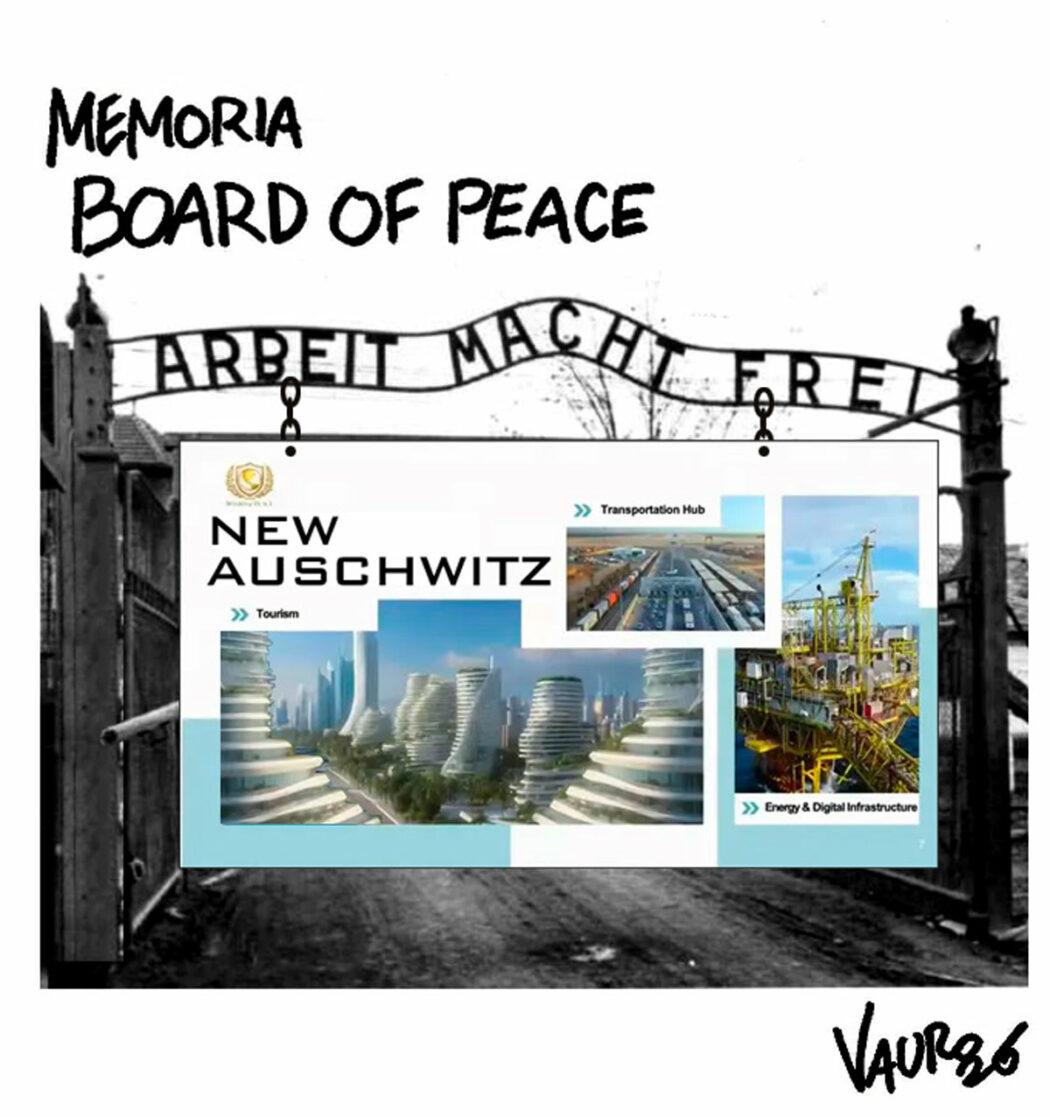 Nel disegno, l'ingresso della campo di concentramento di Auschwitz. Appesa al cancello una cartolina che ritrae il progetto americano di Gaza City denominato 'New Auschwitz'.