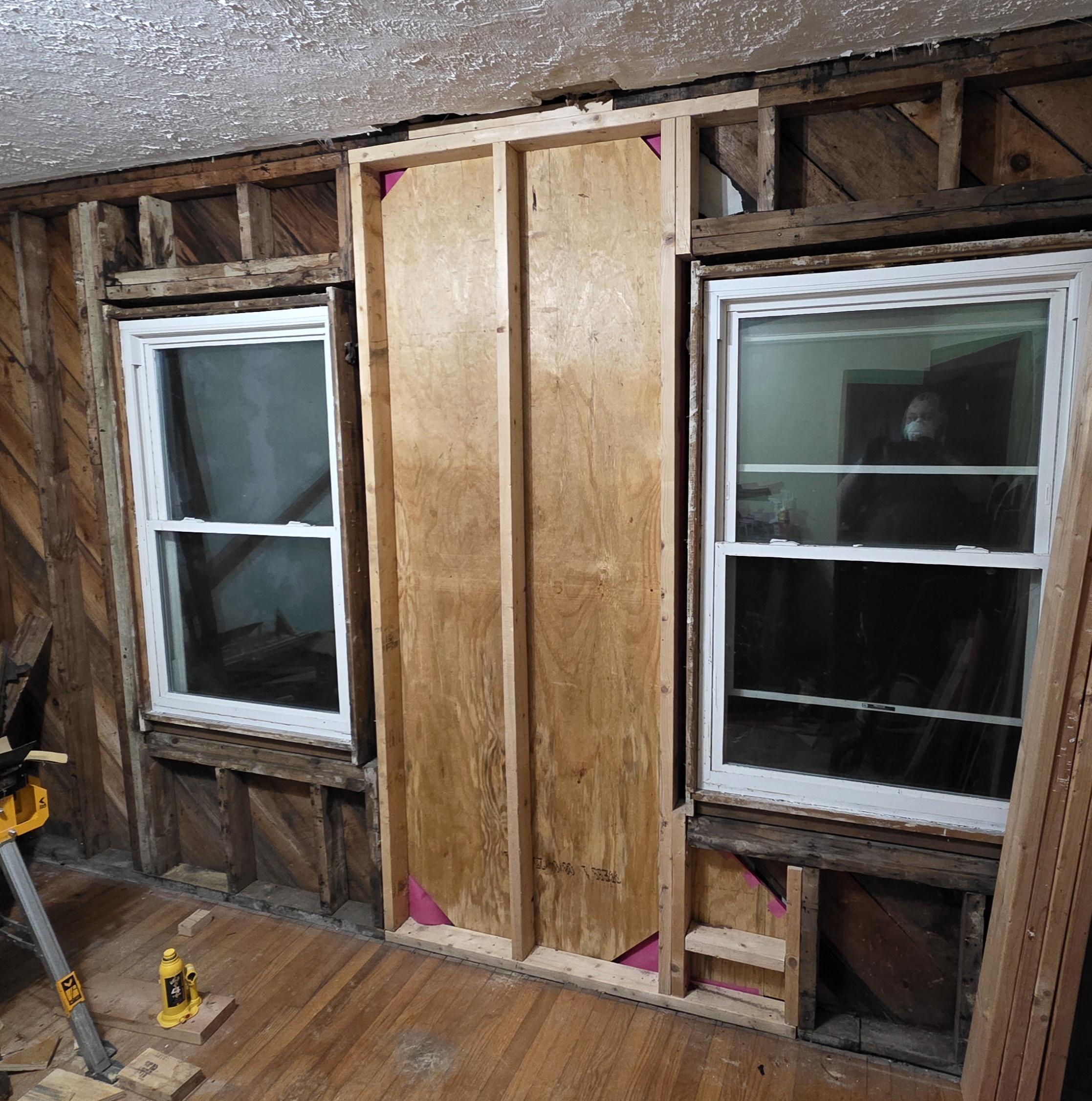 An old wall, stripped down to studs with new lumber replacing a large section of the middle.