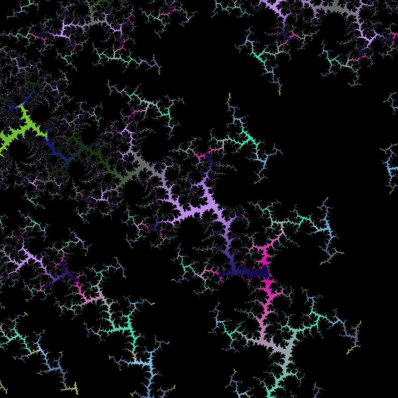 A render of the mandelbrot set using randomised colours. The centre point is -0.3098213594934558 + 0.6198225055186624i and we are zoomed to 1.0327090644e+06 magnitude.