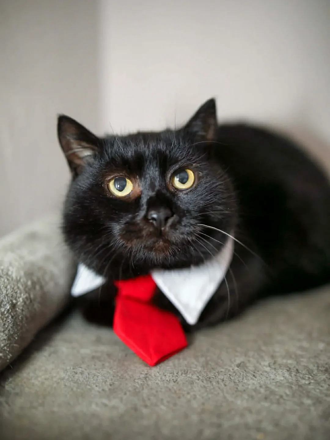 A dapper black kitty with bright, curious eyes, lounging like he owns the place rocking a crisp white collar and a bold red