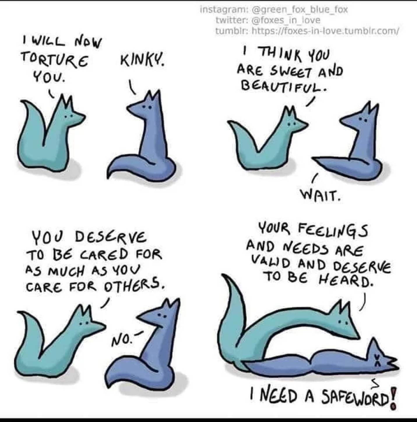 a 4 panel foxes in love comic green: i will now torture you. blue: kinky green: i think you are sweet and beautiful. blue: wait green: you deserve to be cared for as much as you care for others. blue: no. green: your feelings and needs are valid and deserve to be heard. blue: i need a safeword!