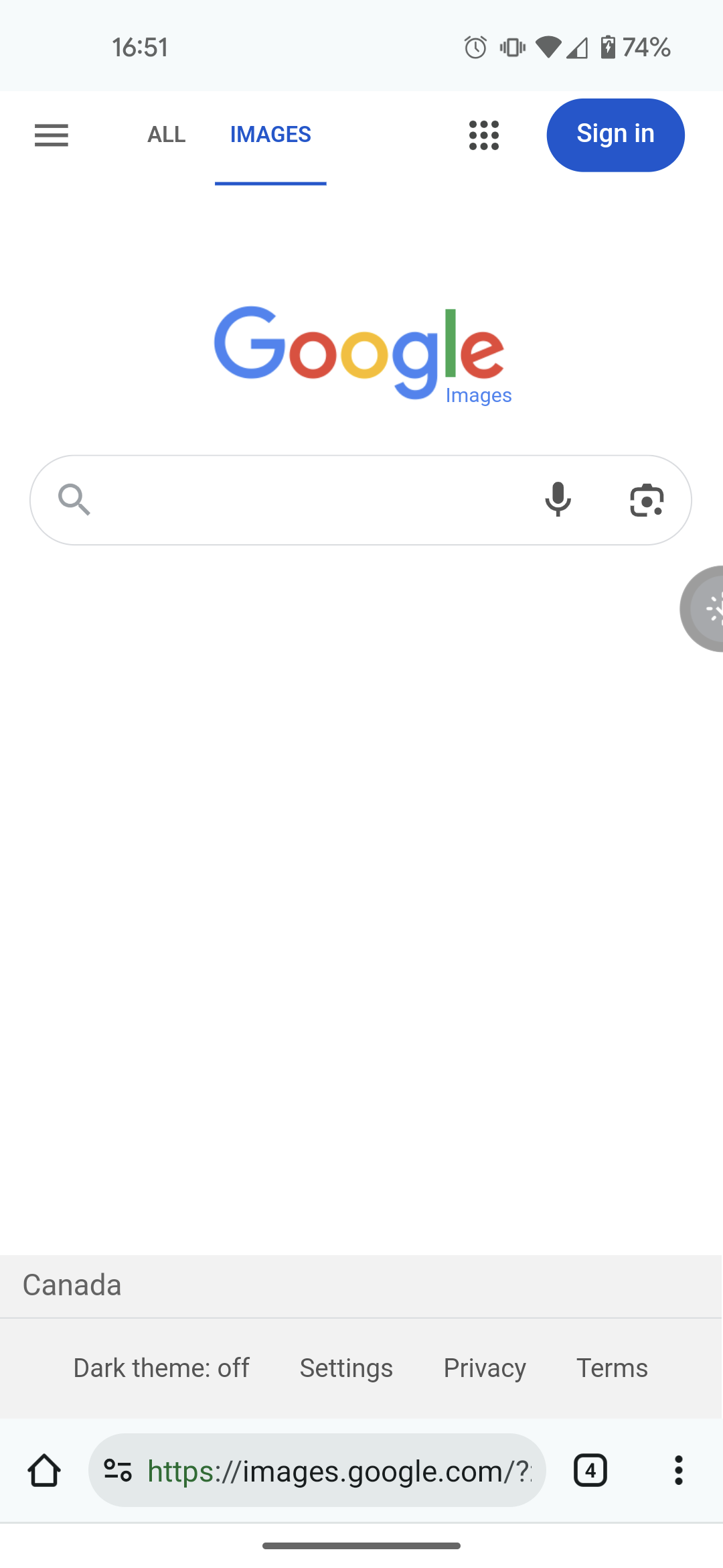 The page βimages.google.comβ following modern Google designs, featuring a voice input button and reverse image search button, and a dark theme switch