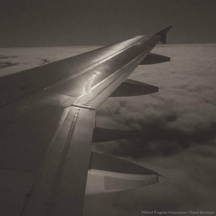 A plane's wing above cloud, reflecting moonlight, cover of the Milford Progress Association album "Postal Boutique".
