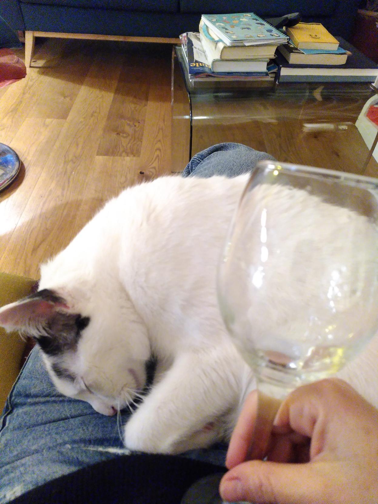 Gatto Coco acciambellato sulle gambe di zia Rolery, che ha in mano un bicchiere di vino bianco. Si vede una parte di casa, soprattutto il pavimento di legno e un tavolino di vetro con pile di libri in disordine. Scusate, domani metto a posto.