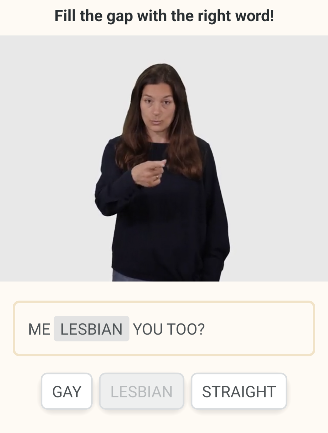 A screenshot of an ASL tutorial app where the user is asked to "fill in the gap with the right word" and the sentence in questions is "Me _____, you, too?" Possible definitions are "Gay" "Lesbian" and "Straight" The correct answer is Lesbian.