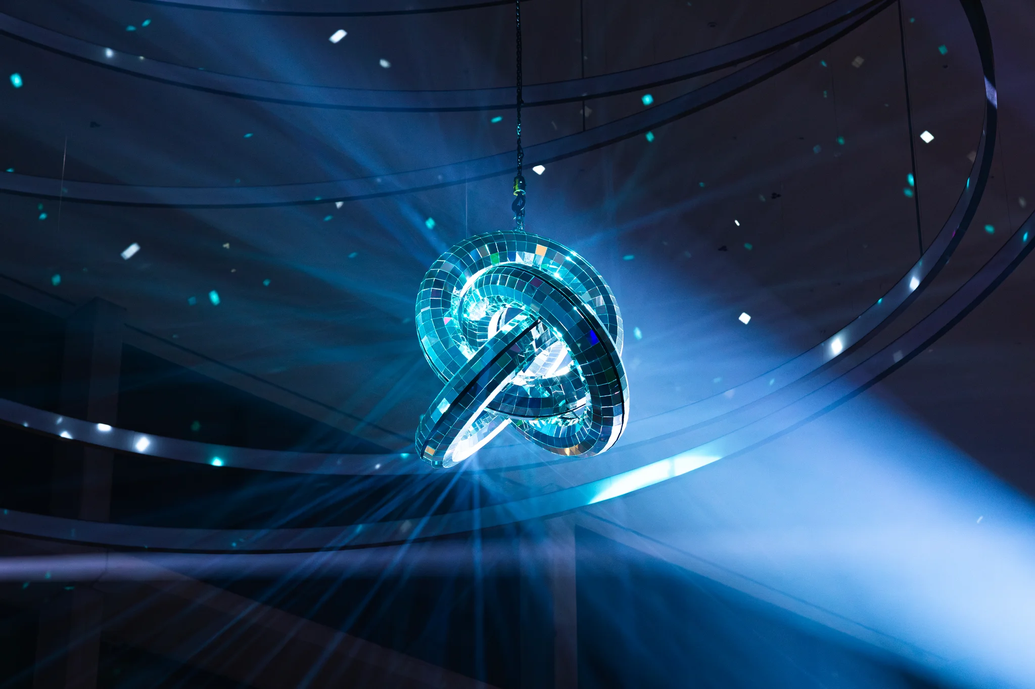 a disco ball-like structure consisting of 3 intertwined rings is refracting a light blue spotlight pointed onto it, causing little reflections to appear all over the big entrance hall's ceiling
