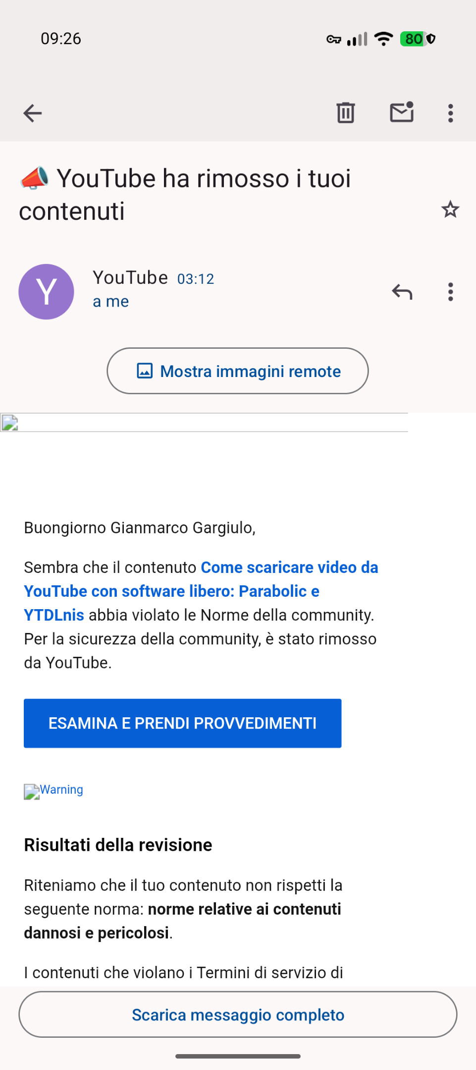 Screenshot di Thunderbird sul mio telefono con la mail "YouTube ha rimosso i tuoi contenuti" che afferma che il video su Parabolic e YTDLnis ha violato le Norme della community in ambito di "contenuti dannosi e pericolosi".