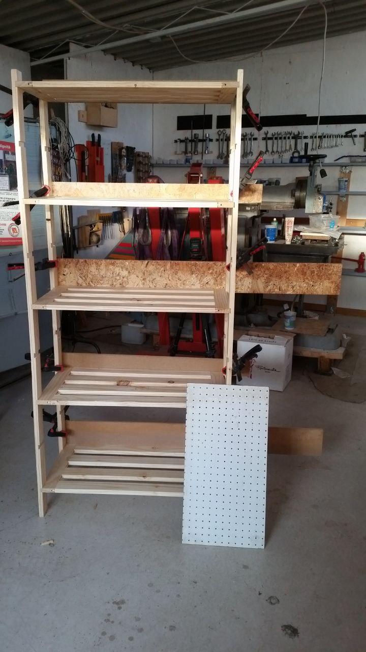 Scaffale in legno con sponde sulla parte posteriore, ancora fermate con morsetti. Per chi ha studiato statica dei materiali avranno un comportamento a piastra, per le altre persone⦠fidatevi! Il pezzo bianco forato a terra verrà fissato su un fianco per appenderci cose con i gancetti.