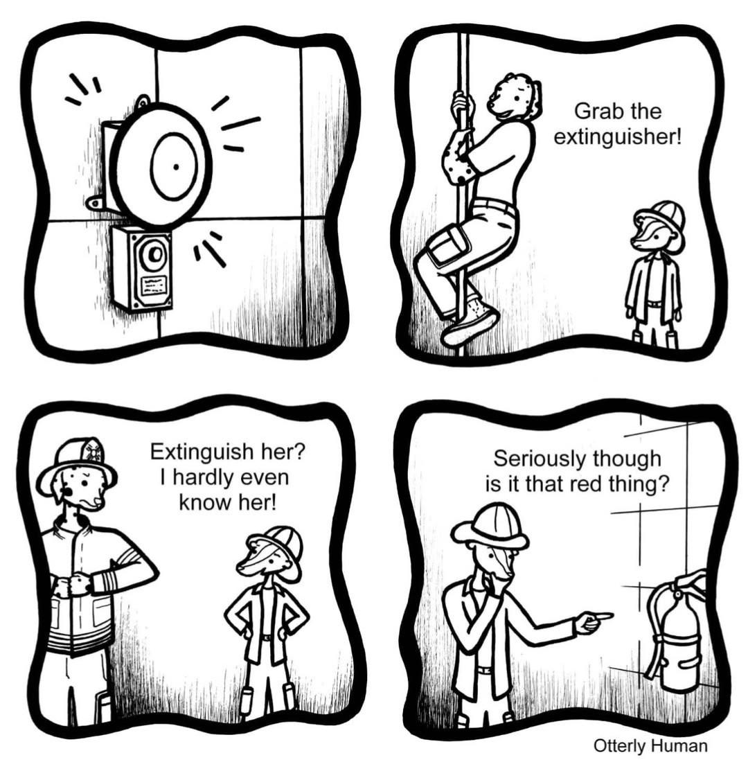 [First day at work as a fireman] Other Fireman: Grab the extinguisher! Me: Extinguish her? I hardly even know her! Me: Seriously though is that the red thing?