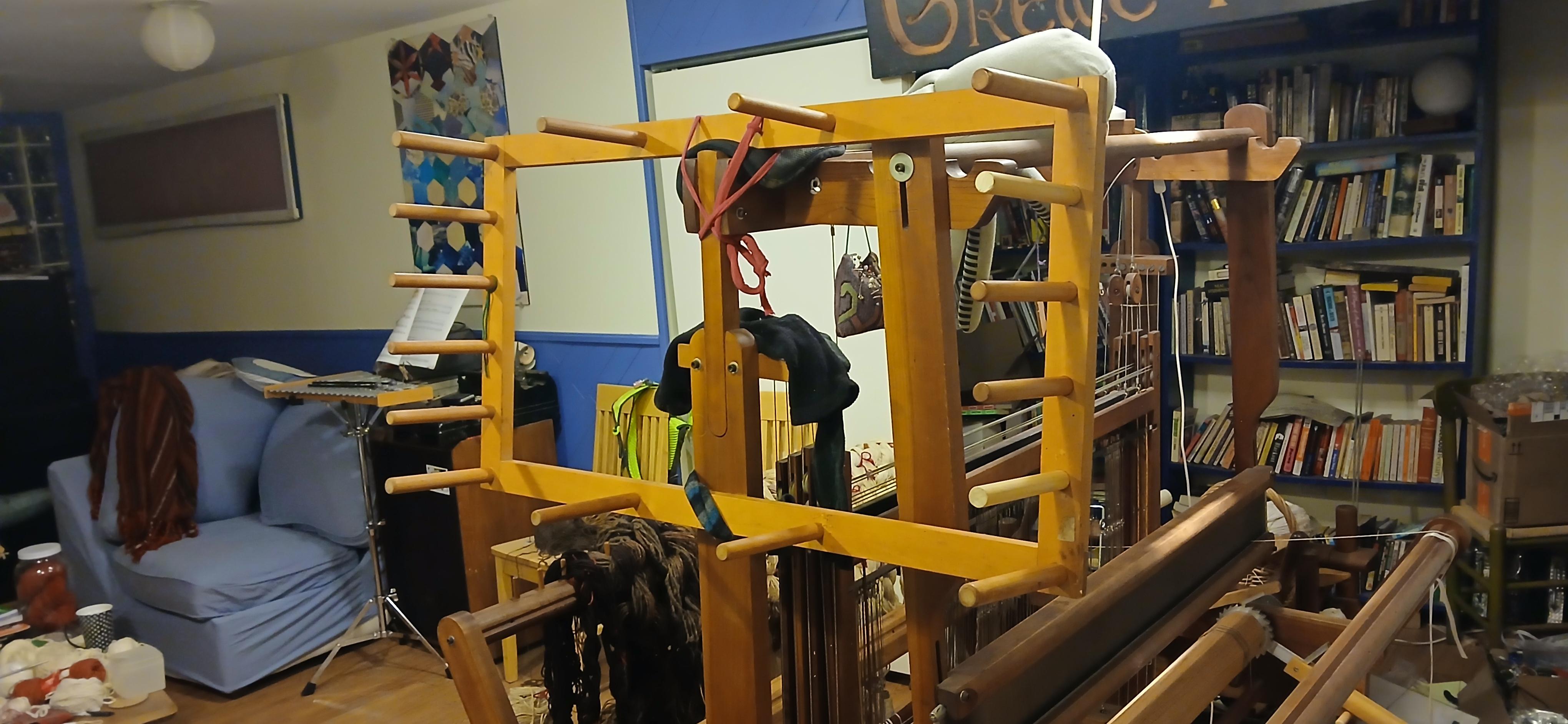 Cherrywood framework with sixteen pegs sticking out, on the side of a rug loom in a messy basement