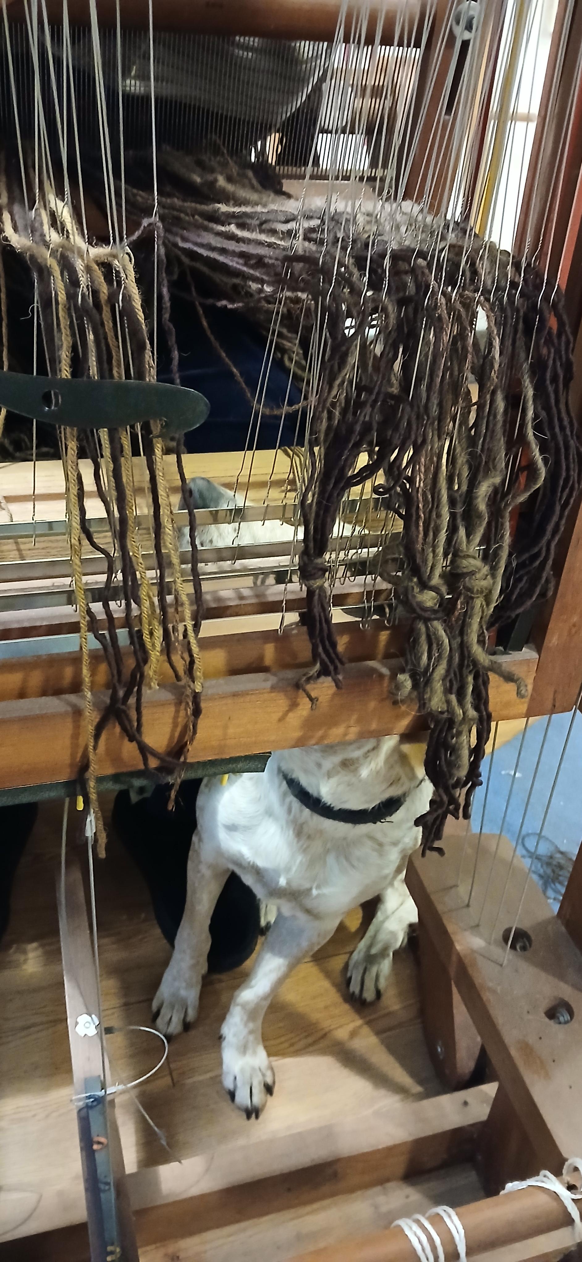 A hooligan red heeler with her nose up between the beater and the frames with her feet on the frame pedals