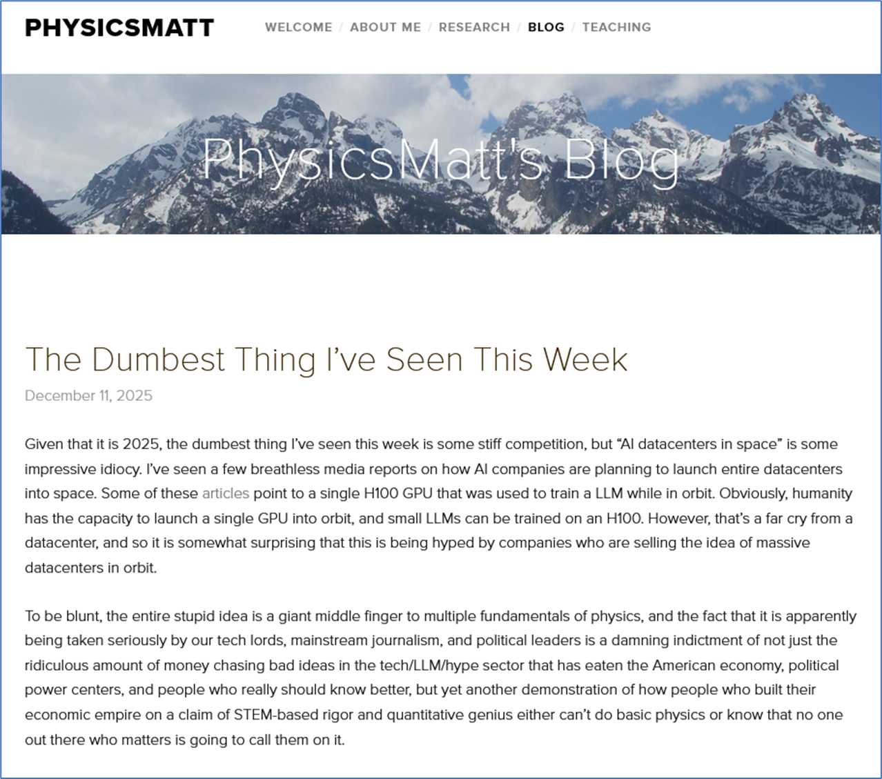 Image of the top of the article - The Dumbest Thing Iโve Seen This Week December 11, 2025 Given that it is 2025, the dumbest thing Iโve seen this week is some stiff competition, but โAI datacenters in spaceโ is some impressive idiocy. Iโve seen a few breathless media reports on how AI companies are planning to launch entire datacenters into space. Some of these articles point to a single H100 GPU that was used to train a LLM while in orbit. Obviously, humanity has the capacity to launch a single GPU into orbit, and small LLMs can be trained on an H100. However, thatโs a far cry from a datacenter, and so it is somewhat surprising that this is being hyped by companies who are selling the idea of massive datacenters in orbit. To be blunt, the entire stupid idea is a giant middle finger to multiple fundamentals of physics, and the fact that it is apparently being taken seriously by our tech lords, mainstream journalism, and political leaders is a damning indictment of not just the ridiculous amount of money chasing bad ideas in the tech/LLM/hype sector that has eaten the American economy, political power centers, and people who really should know better, but yet another demonstration of how people who built their economic empire on a claim of STEM-based rigor and quantitative genius either canโt do basic physics or know that no one out there who matters is going to call them on it.