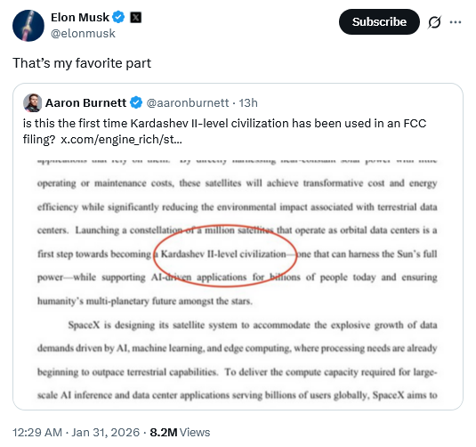 Tweet from Elon Musk @elonmusk Thatβs my favorite part with embedde tweet by Aaron Burnett @aaronburnett is this the first time Kardashev II-level civilization has been used in an FCC filing?