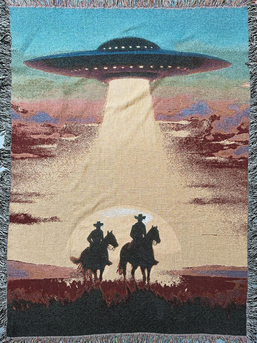 A woven tapestry depicting a retro sci-fi scene where a large, dark UFO hovers in a teal sky, casting a bright yellow tractor beam down toward the ground. In the foreground, two silhouettes of cowboys on horseback are positioned within the light of the beam, set against a backdrop of purple and reddish-pink clouds.