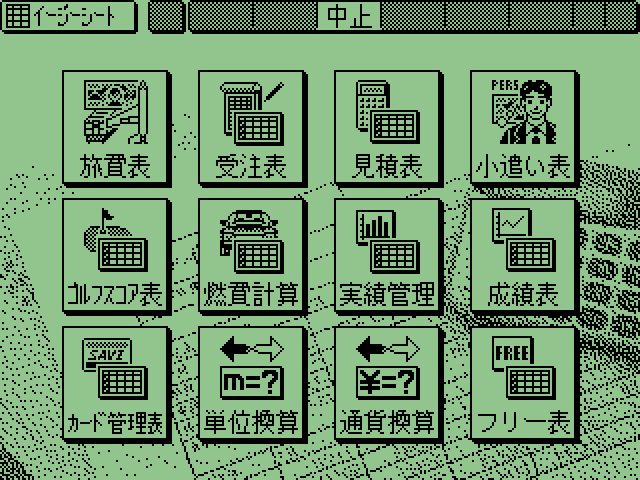 A screenshot of Easy Sheet program showing different categories of spreadsheets, with cute pixel icons. The background is a photo of a paper spreadsheet and a calculator