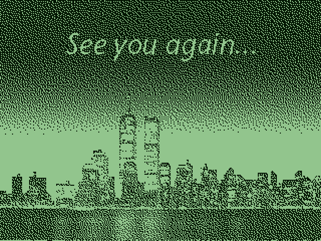 Casio Caleid "See you again..." screen, extracted from ROM. Features a megapolis photo with twin towers