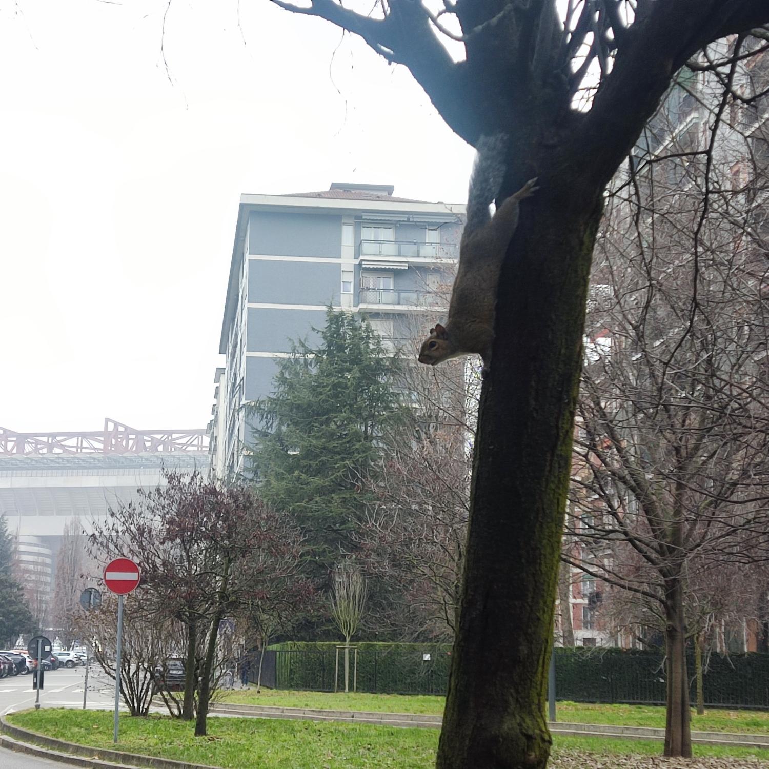 in primo piano sulla destra uno scoiattolo in posa sul tronco di un albero, sullo sfondo alberi, palazzine e altri edifici e cielo grigio