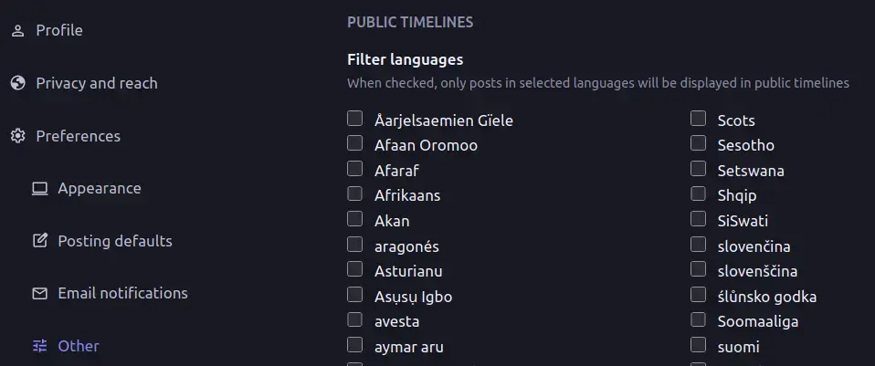 Screenshot of Mastodon > Preferences > Other > Public Timelines > Filter languages