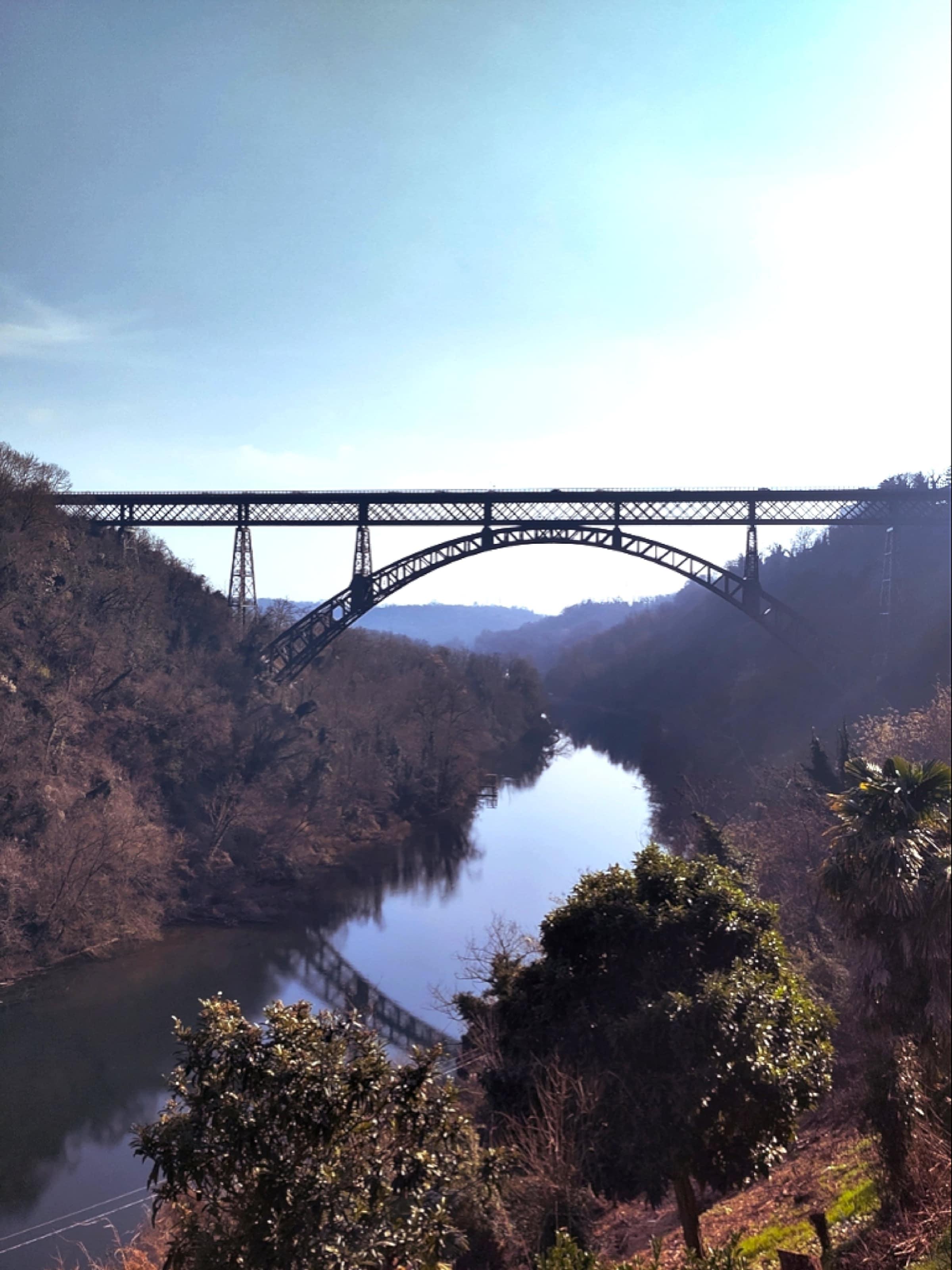 Foto del ponte di Paderno d'Adda. È un ponte in cui l'impalcato unisce i due lati della stretta vallata dove scorre il fiume. L'impalcato e l'arco che lo sorregge sono fatti in travi d'acciaio collegate in tralicci. Nella foto si vede anche il fiume e la vegetazione sulle sponde