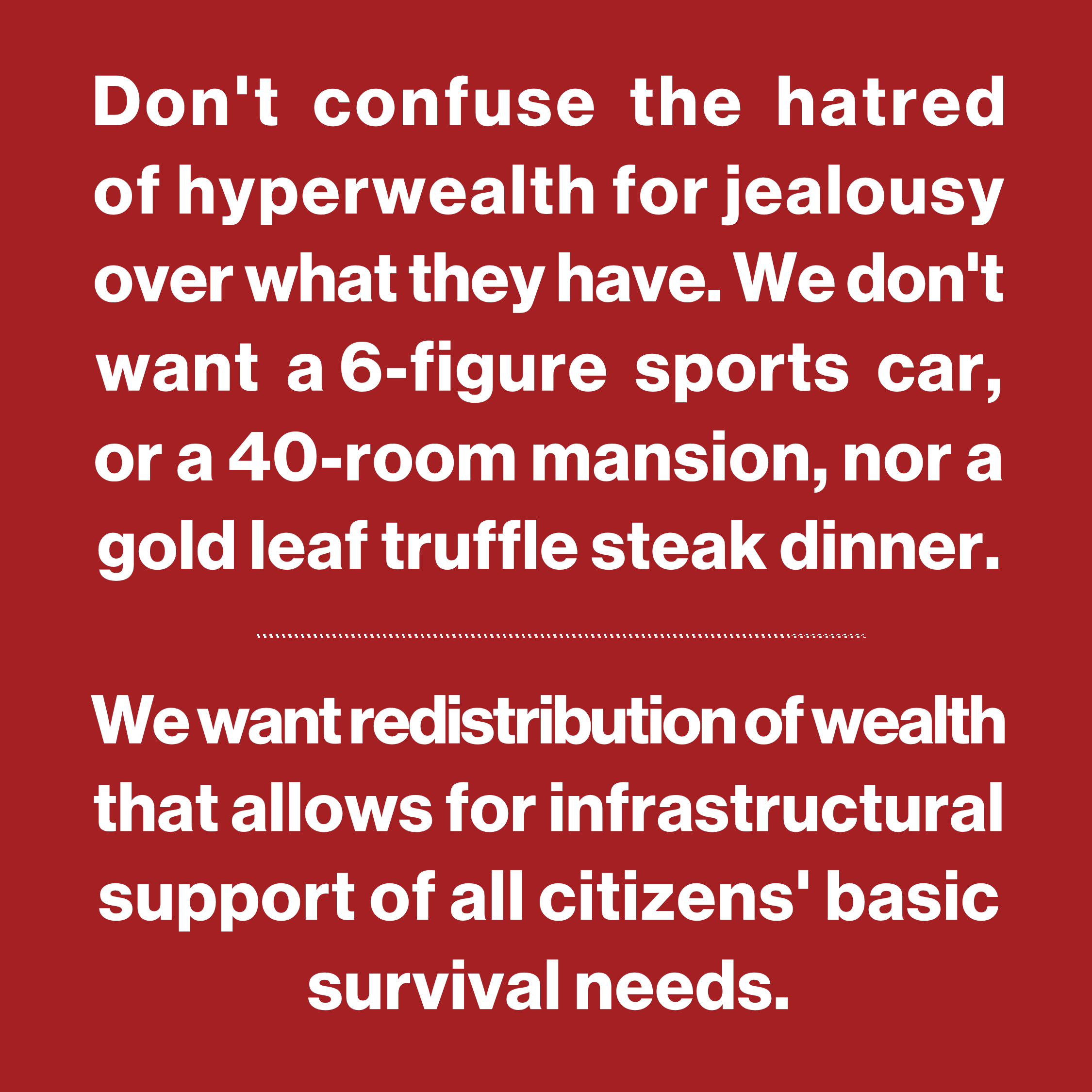 Don't confuse my hatred of the hyperwealthy for jealousy over what they have. I don't want a 6-figure sports car, or a 40-room mansion, or a gold leaf truffle steak dinner. . I want redistribution of wealth that allows for infrastructural support of all citizens' basic survival needs.