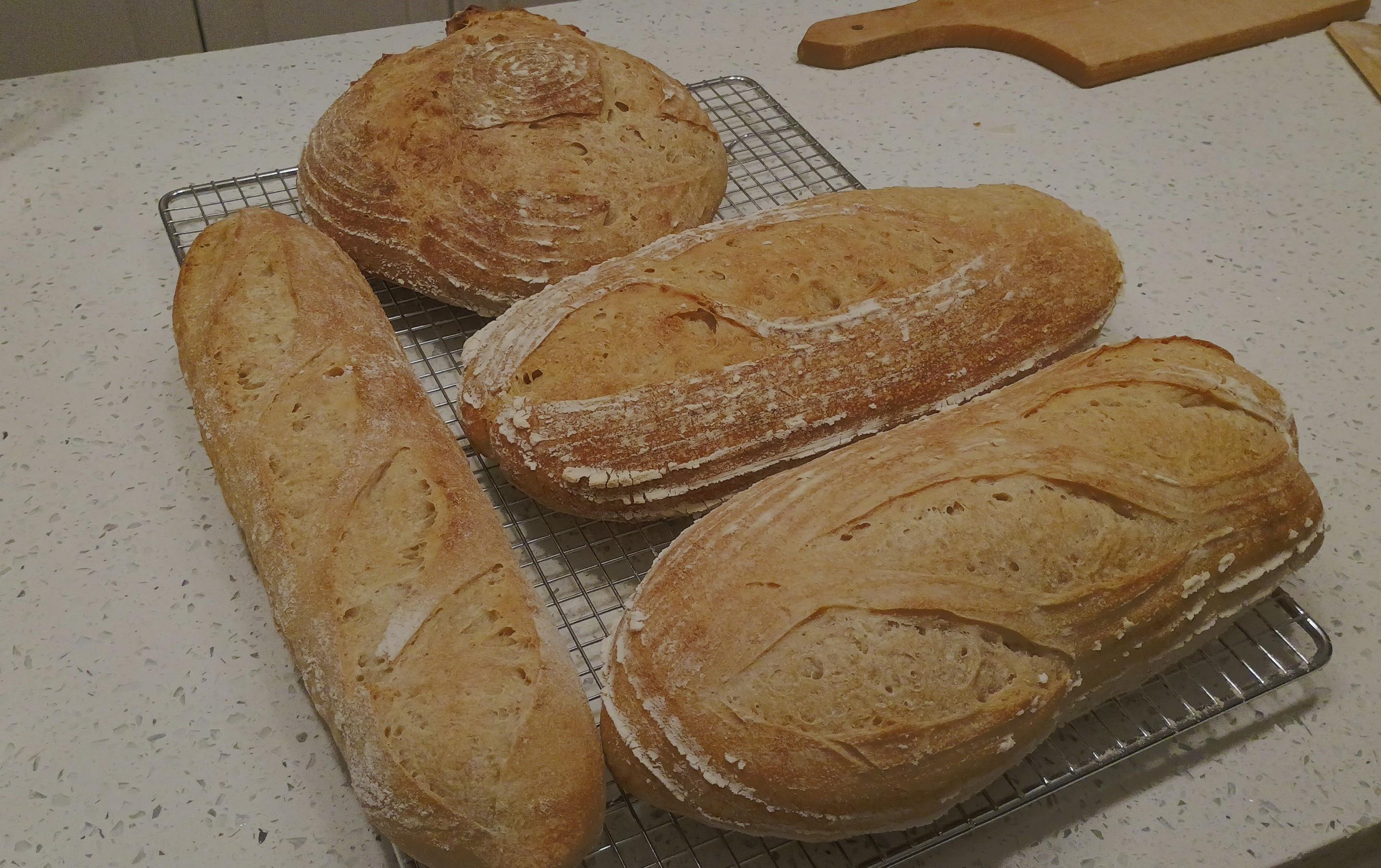 On a countertop wire rack, three loaves of bread are cooling, as is a long thin baguette.