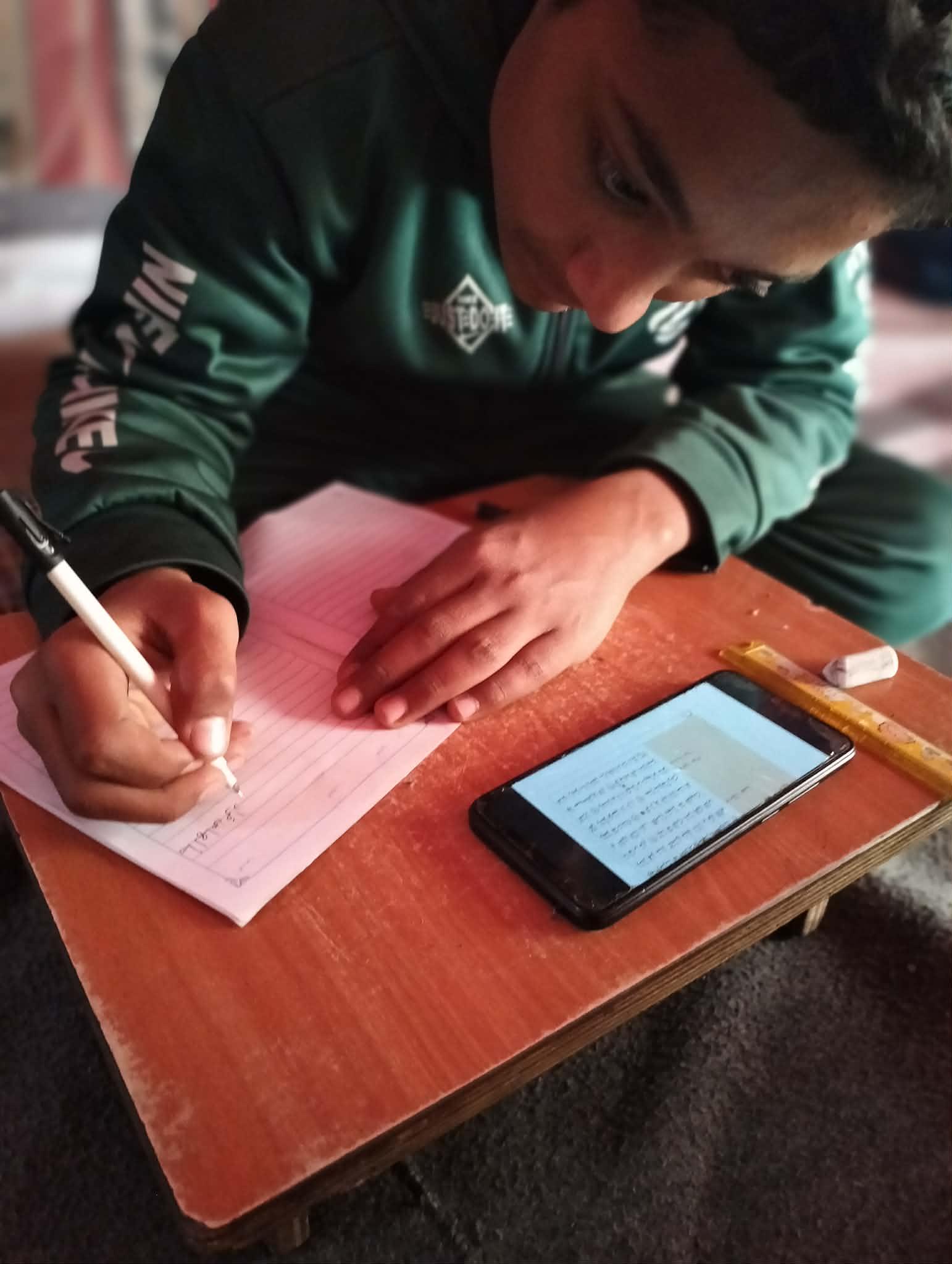 Abdul Rahman in a green sweatshirt writing on lined paper with a pen, a smartphone with text on the screen, a ruler, and an eraser are on a wooden desk.
