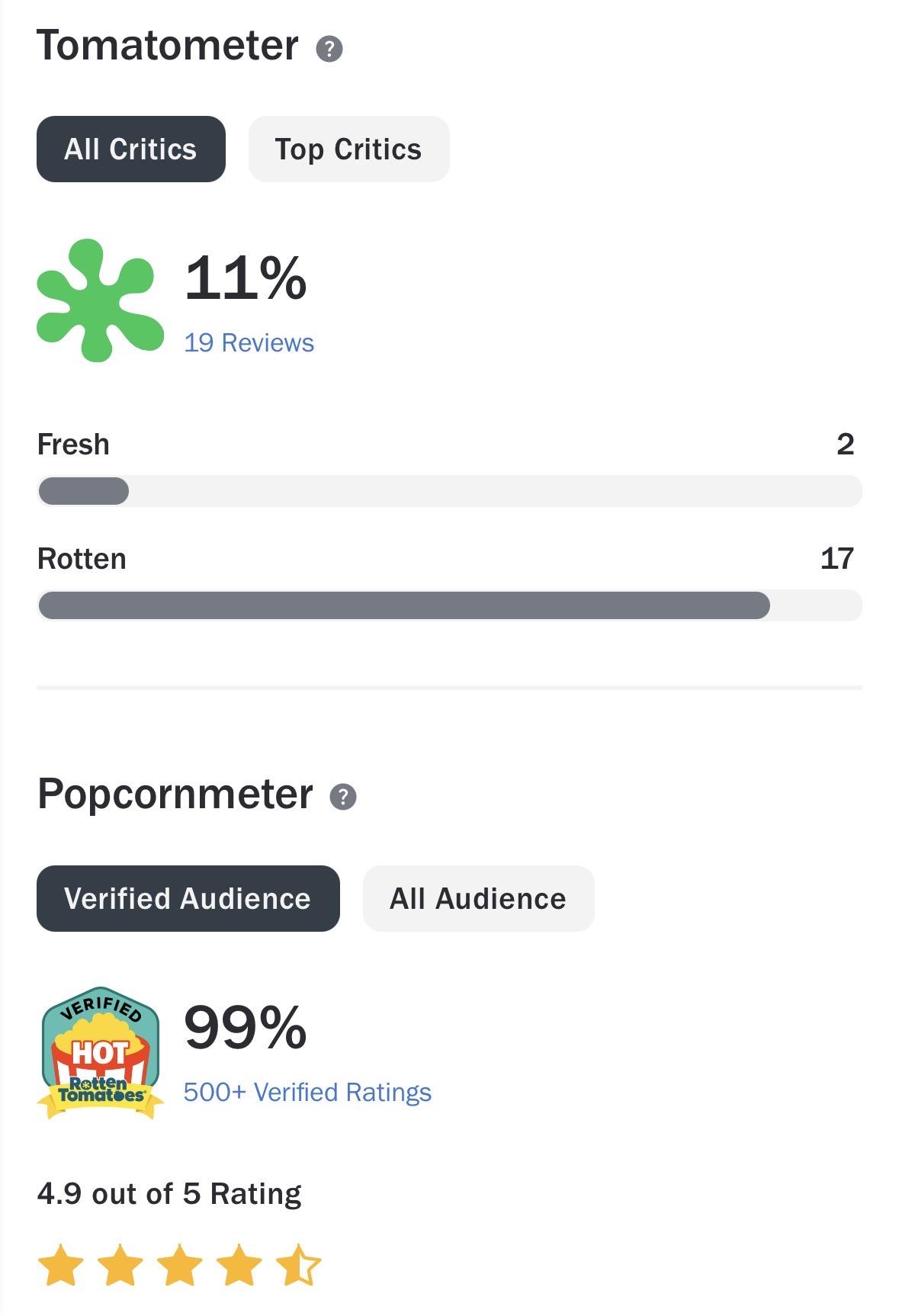 Tomatometer All Critics Top Critics 11% 19 Reviews 2 Fresh 17 Rotten Popcornmeter Verified Audience Rotten Tomatoes 99% 500+ Verified Ratings 4.9 out of 5 Rating