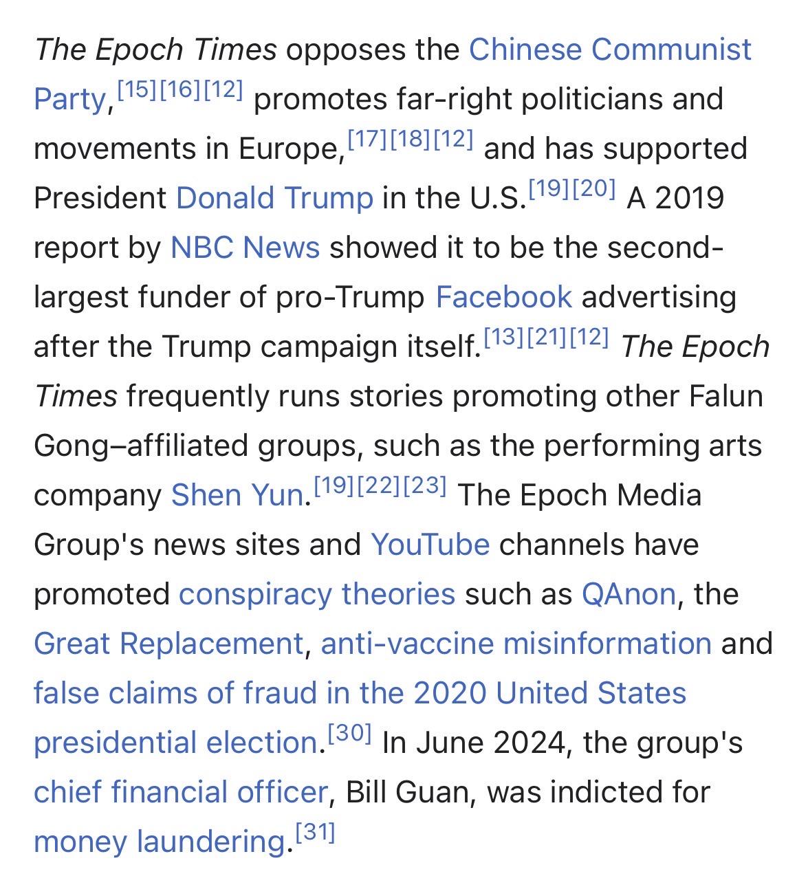 The Epoch Times opposes the Chinese Communist Party, [15][16][121 promotes far-right politicians and movements in Europe, 1171118][121 and has supported President Donald Trump in the U.S. 191120] A 2019 report by NBC News showed it to be the second- largest funder of pro-Trump Facebook advertising after the Trump campaign itself. 131121][12] The Epoch Times frequently runs stories promoting other Falun Gong-affiliated groups, such as the performing arts company Shen Yun.['9||22][23] The Epoch Media Group's news sites and YouTube channels have promoted conspiracy theories such as QAnon, the Great Replacement, anti-vaccine misinformation and false claims of fraud in the 2020 United States presidential election.' 1301 In June 2024, the group's chief financial officer, Bill Guan, was indicted for money laundering. [31]