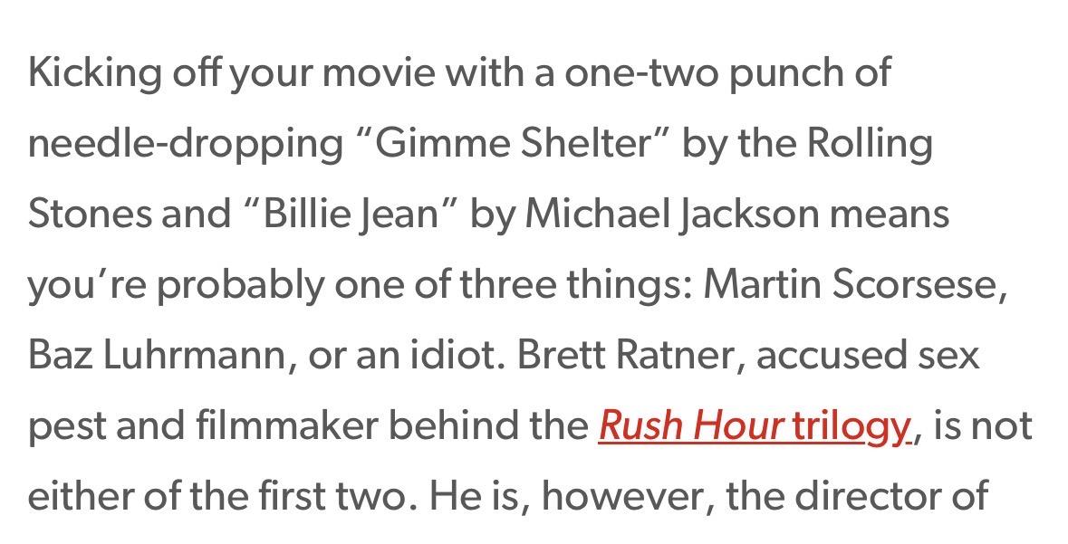 Kicking off your movie with a one-two punch of needle-dropping "Gimme Shelter" by the Rolling Stones and "Billie Jean" by Michael Jackson means you're probably one of three things: Martin Scorsese, Baz Luhrmann, or an idiot. Brett Ratner, accused sex pest and filmmaker behind the Rush Hour trilogy, is not either of the first two. He is, however, the director of