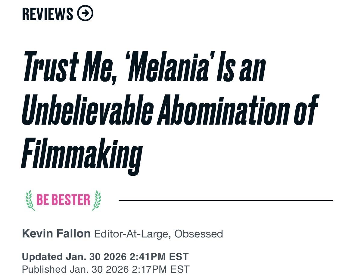 REVIEWS O Trust Me, 'Melania Is an Unbelievable Abomination of Filmmaking BE BESTER Kevin Fallon Editor-At-Large, Obsessed Updated Jan. 30 2026 2:41PM EST Published Jan. 30 2026 2:17PM EST