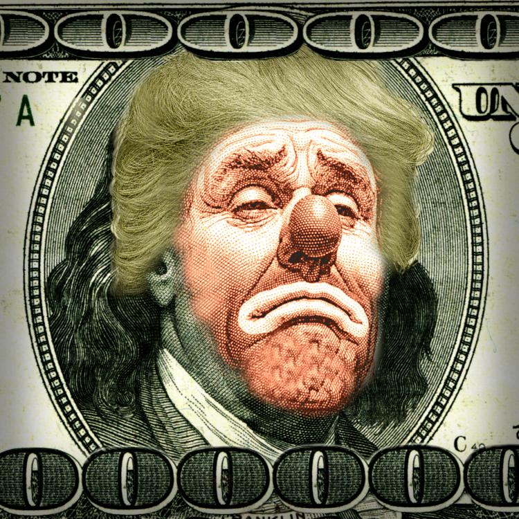 A detail from a US$100 bill showing Benjamin Franklin's portrait. It has been altered. Franklin's face has been overlaid with an orange sad clown, surmounted by Trump's hair. The zeroes in '100' above and below the portrait have been extended to run its entire length.