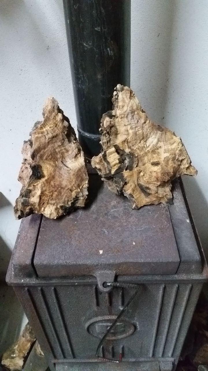 Due bitorzoli di legno di olivo appoggiati sul piano della stufa.