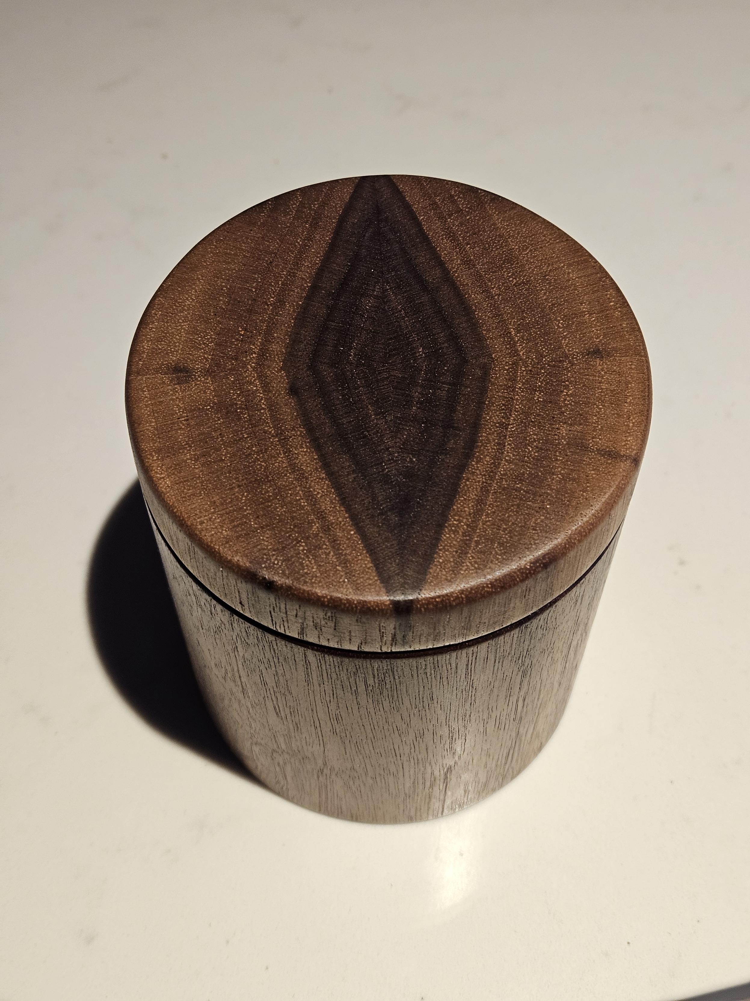 Picture of a walnut salt well I made 8n my garage workshop. The lid is made so the end grain pattern looks like a cat eye.