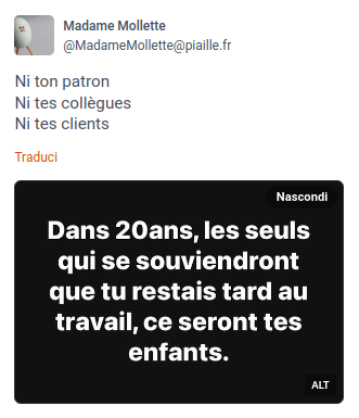 Madame Mollette Ni ton patron Ni tes collegues Ni tes clients Dans 20ans, les seuls qui se souviendront que tu restais tard au travail, ce seront tes enfants.